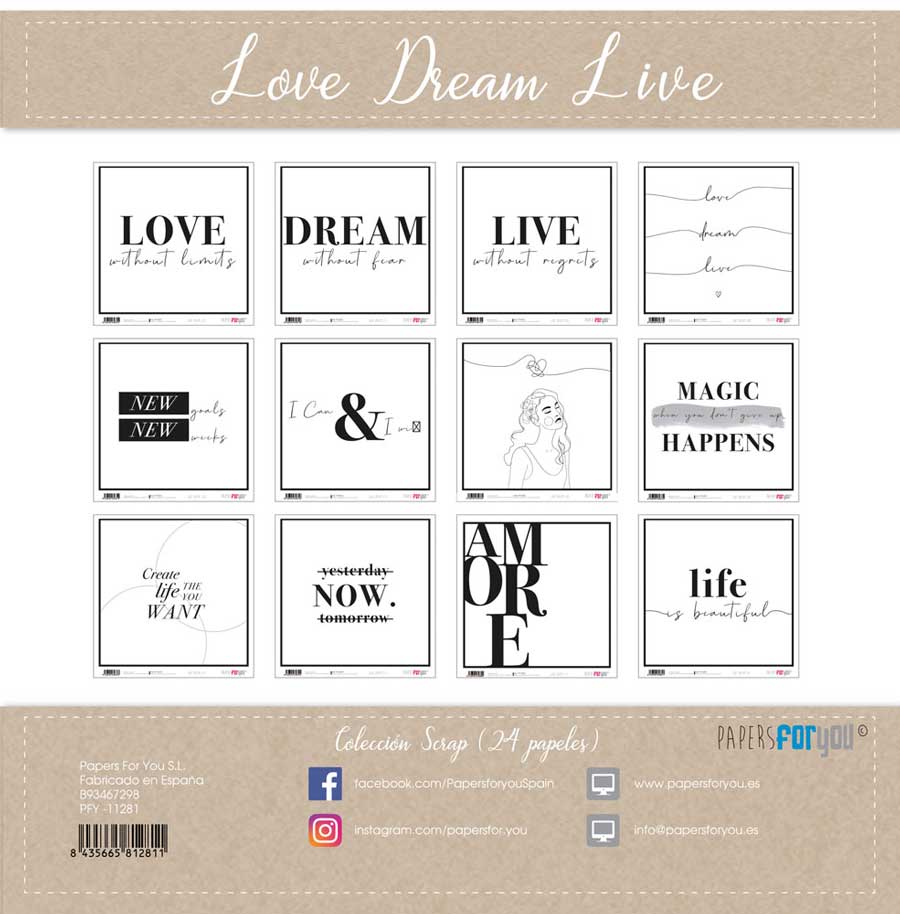 PFY-11281 – Colección 24 Papeles Scrap doble cara 180gr 8»x8» (Love Dream Live) – pack 3 ud.