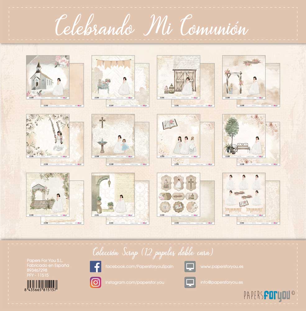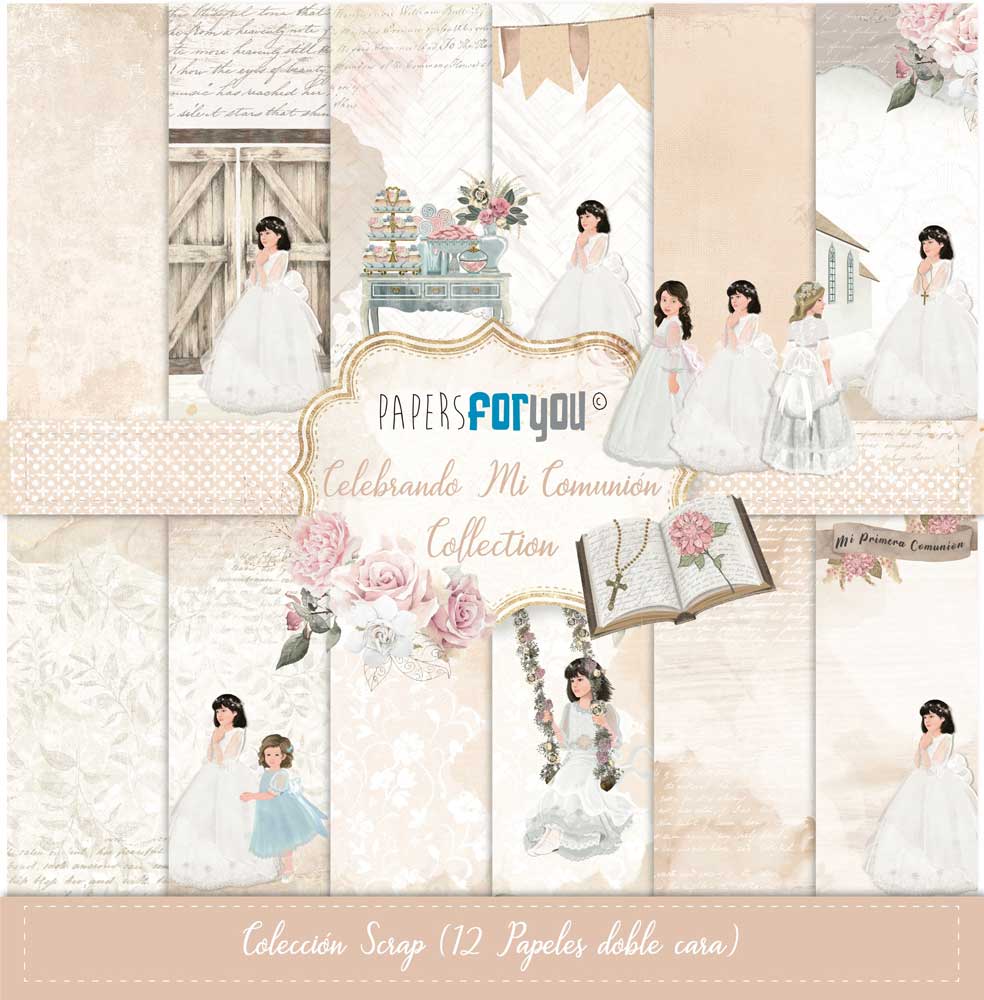 PFY-11515 – Colección 12 Papeles Scrap doble cara 180gr 12″x12″ (Celebrando Mi Comunión Niña Morena) – pack 3 ud.