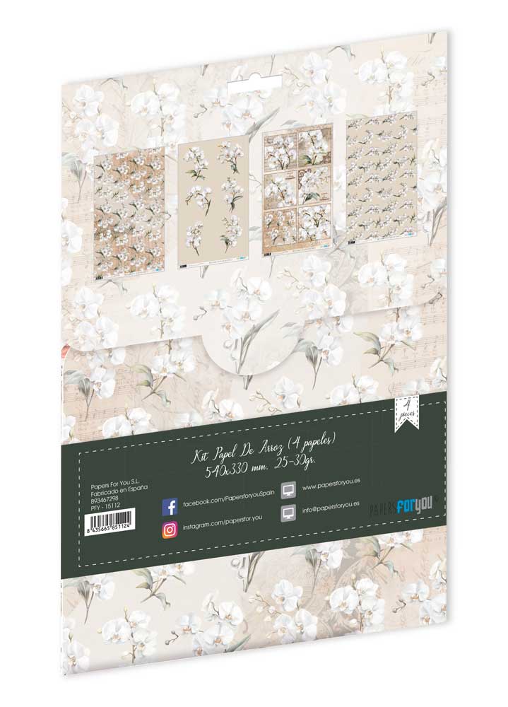 PFY-15112 – Colección de 4 Papeles Arroz 54×33 cm 25-30 gr. (La Vie En Fleurs White Orchid) – pack 4 ud.