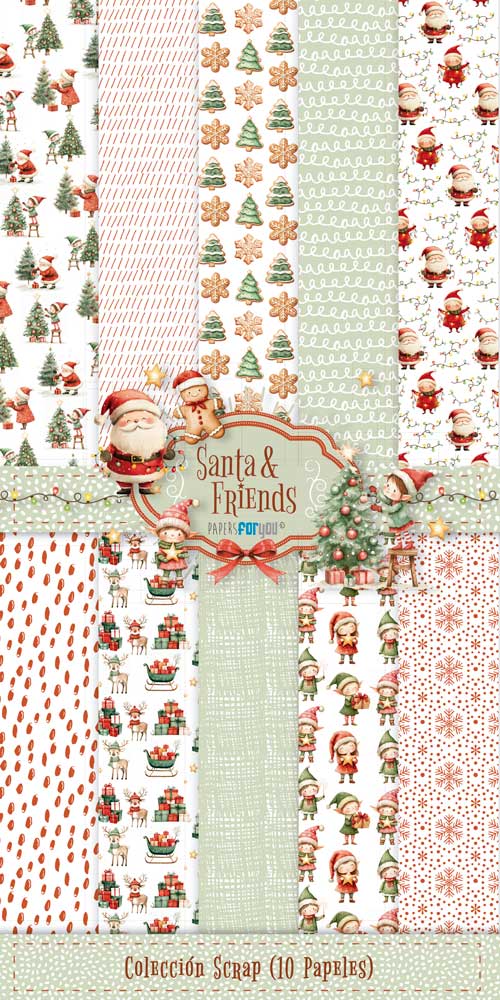 PFY-15402 – Colección 10 Papeles Scrap Una cara 180gr 6″x12″ (Santa & Friends) – pack 4 ud.